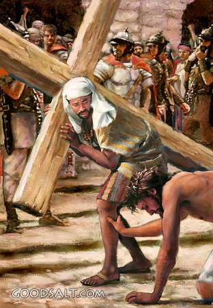 Simon a Cyrenian Bear Jesus' Cross Mark 15:21-22 lord, master, messiah, people, agony, pain, calvary, suffering, sadness, carrying, help, helping, week, christ, black, Jesus, thorn, sorrow, cyrenian, emmanuel, immanuel, toil, ethnic, man, men, crown, african, ethiopian, bear, taunt, crowd, simon, compassion, dying, weak, sacrificial, savior, cross, burden, torture, sacrifice, easter, passion, carry, crucifixion, crucify, soldiers PROJECTION - License for PowerPoint™ PRINT – buy a print of this picture; optional frame Bible Hub |