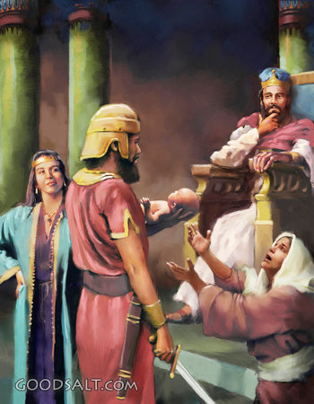 King Solomon's Wisdom of the Baby 1 Kings 3 character, people, stories, divide, lie, decision, woman, man, men, women, crown, loving, baby, infant, person, greedy, kingdom, soldier, wisdom, wise, king, sacrificial, throne, jealous, solomon, callous, mother, male, female, parent, israel, prostitute, envious, ruling, love, sword PROJECTION - License for PowerPoint™ PRINT – buy a print of this picture; optional frame Bible Hub |