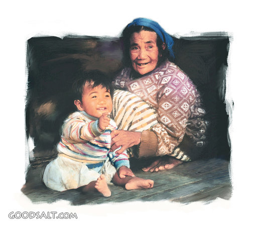 happy, joy, content, woman, child, boy, baby, grandma, grandmother, poverty, family