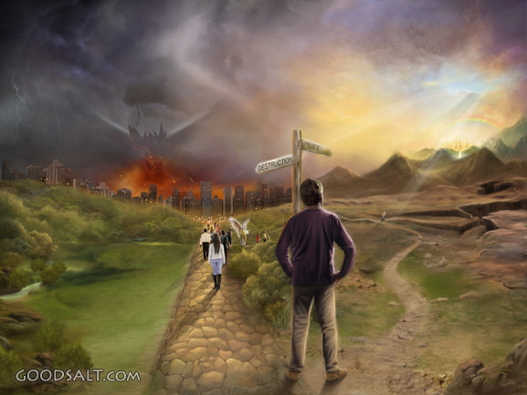 The Narrow Way. Matthew 7:13-14 broad, narrow, follow, gate, enter, decision, man, life, heaven, destruction, faith, righteous, eternal, road, wide, wayfarer PROJECTION - License for PowerPoint™ PRINT – buy a print of this picture; optional frame Bible Hub |