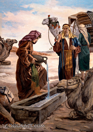 Rebekah at the Well Genesis 24:15-20 help, helping, isaac, watering, assistant, maiden, trough, well, camel, rebecca, servant, rebekah, Eliezer, rebekah and camels, aram-naharaim PROJECTION - License for PowerPoint™ PRINT – buy a print of this picture; optional frame Bible Hub |