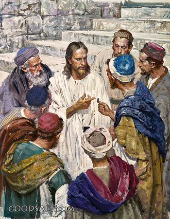 Render Unto Caesar What Is Caesar's Matthew 22:15-22 Mark 12:13-17 Luke 20:20-26 christ, Jesus, talk, talking, men, apostle, disciple, money, coin, male, denarius, harry anderson PROJECTION - License for PowerPoint™ PRINT – buy a print of this picture; optional frame Bible Hub |