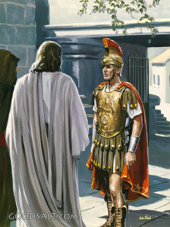 Jesus and Centurion Matthew 8:5-13 Luke 7:1-10 christ, Jesus, talk, talking, men, faith, centurion, soldier, roman, guard, servant, john steel, pacific press publishing PROJECTION - License for PowerPoint™ PRINT – buy a print of this picture; optional frame Bible Hub |
