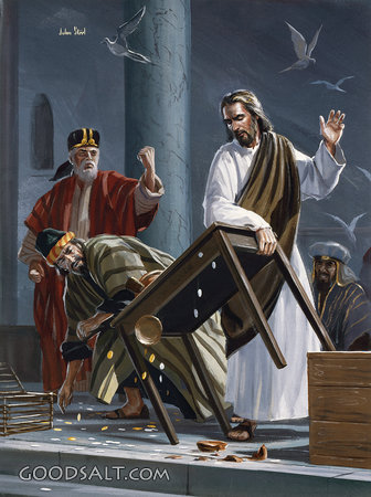 Jesus and the Money Changers Matthew 21:12-13 Mark 11:15-17 John 2:13-17 christ, Jesus, selling, sell, table, clearing, clear, dove, men, temple, money, den, robber, merchant, john steel, moneychangers PROJECTION - License for PowerPoint™ PRINT – buy a print of this picture; optional frame Bible Hub |