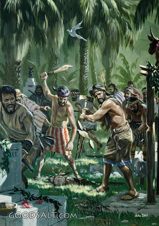 Destroying the High Places Exodus 34:13 Deuteronomy 7:5 Deuteronomy 12:3 2 Kings 18:4 2 Kings 23:14 2 Chronicles 14:3 2 Chronicles 17:6 2 Chronicles 19:3 2 Chronicles 31:1 2 Chronicles 34:3-7 fight, fighting, hunter, men, tree, weapon, angry, idolatry, male, forest, idols, john steel, high places PROJECTION - License for PowerPoint™ PRINT – buy a print of this picture; optional frame Bible Hub |