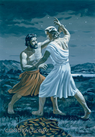 Jacob's Struggle With Angel of God Genesis 32 angel, night, jacob, clyde provonsha, jacob's struggle, jacob's trial, jacob struggling with angel, pacific press publishing PROJECTION - License for PowerPoint™ PRINT – buy a print of this picture; optional frame Bible Hub |