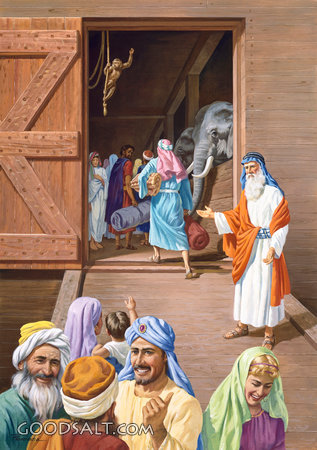 woman, men, ark, elephant, noah, clyde provonsha, noah's ark, people scoffing noah, pacific press publishing