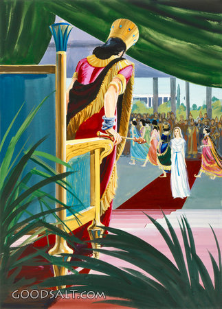 Queen Esther Approaches King Ahasuerus Esther 5:1-2 courage, royal, acceptance, accept, king, throne, queen, announcement, esther, don muth, queen esther, king ahasuerus, king's throne, courts, courageous, pacific press publishing PROJECTION - License for PowerPoint™ PRINT – buy a print of this picture; optional frame Bible Hub |