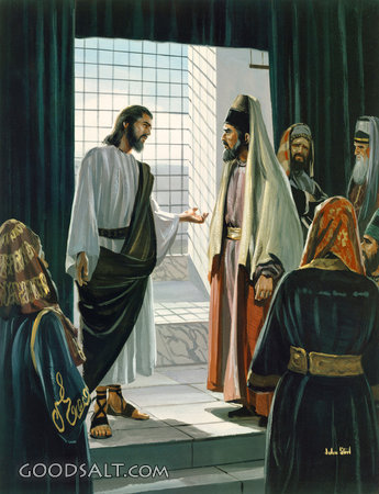 Jesus and a Pharisee Luke 11:37 Matthew 12:38 Matthew 15:1 Matthew 19:3 christ, Jesus, discussion, debate, rabbi, pharisees, consult, rabbis, jesus christ, john steel, jesus and pharisees, high priests, pacific press publishing, js-0159 PROJECTION - License for PowerPoint™ PRINT – buy a print of this picture; optional frame Bible Hub |