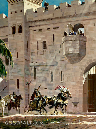 chariot, army, soldiers, conflict, john steel, city gates, pacific press publishing, js-0286