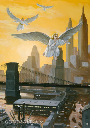 Angel's Trumpet Their Messages Revelation 14:6-13 city, angel, 3, warning, three, urgent, message, angels, messengers, john steel, pacific press publishing, js-0385 PROJECTION - License for PowerPoint™ PRINT – buy a print of this picture; optional frame Bible Hub |