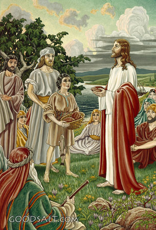 Fish and Loaves Matthew 14:17-19 Mark 6:38-41 Luke 9:13 John 6:9 christ, Jesus, miracle, pray, prayer, loaves, crowds, fishes, pacific press publishing PROJECTION - License for PowerPoint™ PRINT – buy a print of this picture; optional frame Bible Hub |
