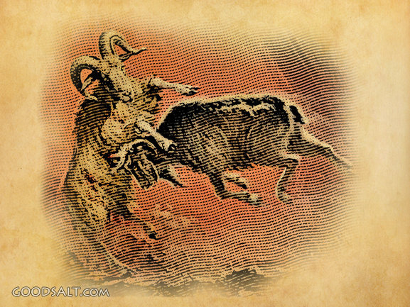 Ram and Goat at War Daniel 8:3-7 symbolism, truth, biblical, rough, 2, fight, fighting, bible, battle, dirty, grey, white, goat, shaggy, scroll, symbol, devil, ram, kingdom, war, daniel, prophecy, persian, prophet, worldly, cosmic, male, scripture, charge, empire, symbolic, symbols, empires, kingdoms, Scriptures, scrolls, conflict, Persia, metaphorical, metaphor, forewarn, god's word, prophesy, old testament, cosmic conflict, scriptural, metaphors, male goat, charging, unicorn, one horn, two horned, two horns, world empires, battles, forewarned PROJECTION - License for PowerPoint™ PRINT – buy a print of this picture; optional frame Bible Hub |