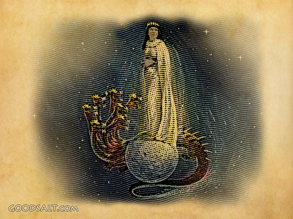 Woman and Dragon Revelation 12:1-3 prophetic, standing, 12, sky, pregnant, attack, attacking, sweeping, sweep, swept, white, moon, church, innocent, tail, skies, chaste, pure, woman, head, crown, universal, universe, feet, vision, devil, victorious, wicked, snake, dragon, satan, revelation, dream, prophecy, night, seven, beast, serpent, satanic, cosmic, red, demon, revealing, repulsive, evil, stand, demons, stars, conflict, revelations, visions, crowns, 7 heads, garland, cosmic conflict, heads, prophetical, 12 stars, garland of stars, great controversy, vulnerable, crown of stars, demonic, 7 crowns, hideous, evening sky PROJECTION - License for PowerPoint™ PRINT – buy a print of this picture; optional frame Bible Hub |