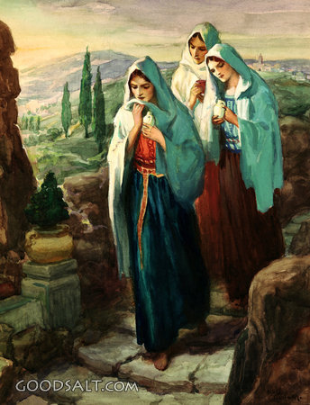 Three Marys on the way to the Tomb Matthew 28:1-7 Mark 16:1-7 Luke 24:1-8 John 20:11-13 way, empty, Jesus, testament, tomb, three, new, resurrection, Karl Godwin, Marys, 00089 PROJECTION - License for PowerPoint™ PRINT – buy a print of this picture; optional frame Bible Hub |