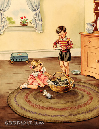 playing, feeding, americana, children, animals, Indoors, Kay Draper, Kittens, 00180