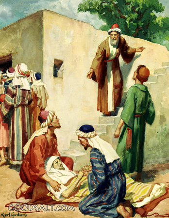 Four Friends Carrying Man to Roof Matthew 9:1-8 Mark 2:1-12 Luke 5:17-26 carrying, Jesus, paralyzed, testament, crippled, man, new, roof, friends, Karl Godwin, Healings, 00227 PROJECTION - License for PowerPoint™ PRINT – buy a print of this picture; optional frame Bible Hub |