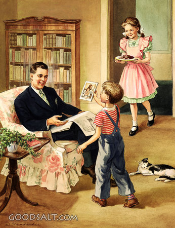 Boy Showing Leaflet to Father Proverbs 29:17 Proverbs 22:6 Proverbs 20:7 Proverbs 17:6 Psalm 127:3-4 father, showing, boy, home, serving, family, americana, Dorothy Handsaker-Scott, Leaflet, 00413, fathersday2014 PROJECTION - License for PowerPoint™ PRINT – buy a print of this picture; optional frame Bible Hub |