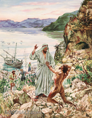 Jesus Heals the Demoniac of Gadara Matthew 8:28-34 Mark 5:1-20 Luke 8:26-39 Jesus, testament, new, possessed, demon, heals, William Brassey Hole, Healings, Demoniac, Gadara, 00675 PROJECTION - License for PowerPoint™ PRINT – buy a print of this picture; optional frame Bible Hub |