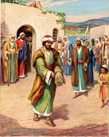 Healed Man Walking Matthew 9:1-8 Mark 2:1-12 Luke 5:17-26 Jesus, paralyzed, testament, crippled, man, new, healed, roof, walking, Healings, H. Willard Ortlip, 01261 PROJECTION - License for PowerPoint™ PRINT – buy a print of this picture; optional frame Bible Hub |