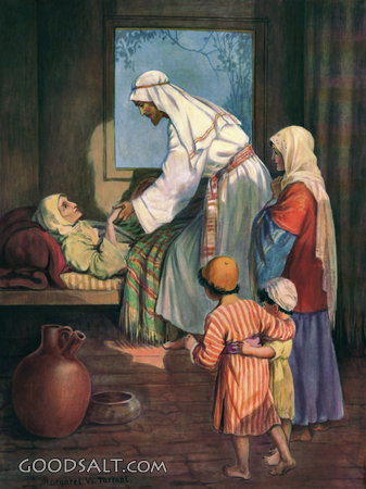 Jesus Took Her Hand Matthew 8:14-17 Mark 1:29-34 Luke 4:38-41 Jesus, sick, testament, law, peter, new, hand, mother, Healings, Took, Margaret W. Tarrant, 01594 PROJECTION - License for PowerPoint™ PRINT – buy a print of this picture; optional frame Bible Hub |