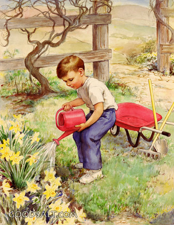 Child Watering Flower Garden 2 Corinthians 5:17 1 Corinthians 3:6 Acts 17:28 flower, gardening, working, child, garden, watering, americana, children, outdoors, Dorothy Handsaker-Scott, 02104 PROJECTION - License for PowerPoint™ PRINT – buy a print of this picture; optional frame Bible Hub |