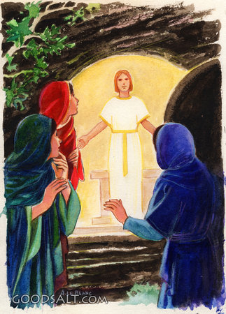 Women and Angel at Tomb Matthew 28:1-7 Mark 16:1-7 Luke 24:1-8 John 20:11-13 angel, empty, Jesus, testament, women, tomb, new, resurrection, Andre LeBlanc, 05575 PROJECTION - License for PowerPoint™ PRINT – buy a print of this picture; optional frame Bible Hub |