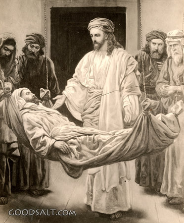 The Power of Jesus Matthew 9:1-8 Mark 2:1-12 Luke 5:17-26 Jesus, paralyzed, testament, crippled, power, new, roof, Healings, William Fredericks, D00231 PROJECTION - License for PowerPoint™ PRINT – buy a print of this picture; optional frame Bible Hub |