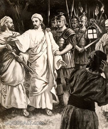 Christ Betrayed and Arrested Matthew 26:51-54 Mark 14:47 Luke 22:50-51 John 18:10-11 Matthew 26:47-56 Mark 14:43-52 Luke 22:47-53 John 18:1-12 week, christ, Jesus, betrayed, testament, arrested, new, garden, easter, passion, William Fredericks, Scourged, D00336 PROJECTION - License for PowerPoint™ PRINT – buy a print of this picture; optional frame Bible Hub |
