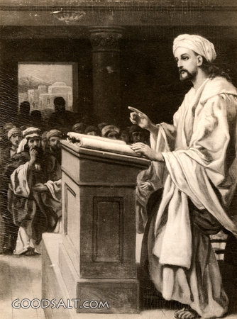 Jesus in the Synagogue Matthew 4:13-17 Matthew 13:54-58 Mark 1:14-15 Mark 6:1-6 Luke 4:14-32 John 4:43-45 Matthew 13:54-58 Mark 6:1-6 Jesus, nazareth, testament, rejection, early, life, ministry, new, synagogue, William Fredericks, D00597 PROJECTION - License for PowerPoint™ PRINT – buy a print of this picture; optional frame Bible Hub |