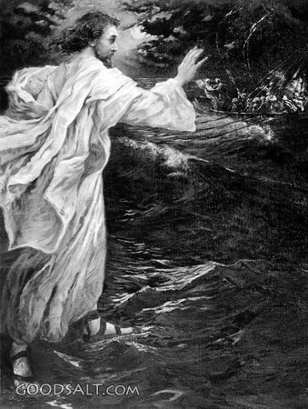 Jesus Walking on the Sea Matthew 14:22-33 Mark 6:45-54 John 6:15-21 water, Jesus, testament, sea, new, walking, miracles, walks, Malcolm Fraser, D00682 PROJECTION - License for PowerPoint™ PRINT – buy a print of this picture; optional frame Bible Hub |