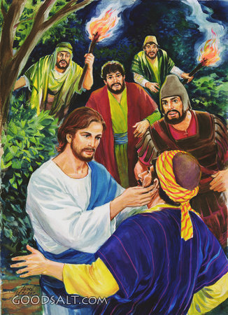 Jesus Healing Malchus' Ear Matthew 26:51-54 Mark 14:47 Luke 22:50-51 John 18:10-11 week, Jesus, healing, testament, arrested, new, garden, ear, passion, Malchus, Andre LeBlanc, 05416 PROJECTION - License for PowerPoint™ PRINT – buy a print of this picture; optional frame Bible Hub |