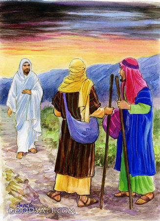 Emmaus Road, 2: Jesus Greets the Men Mark 16:12-13 Luke 24:13-35 Jesus, testament, men, new, road, emmaus, resurrection, Appearances, Greets, Andre LeBlanc, 05699 PROJECTION - License for PowerPoint™ PRINT – buy a print of this picture; optional frame Bible Hub |