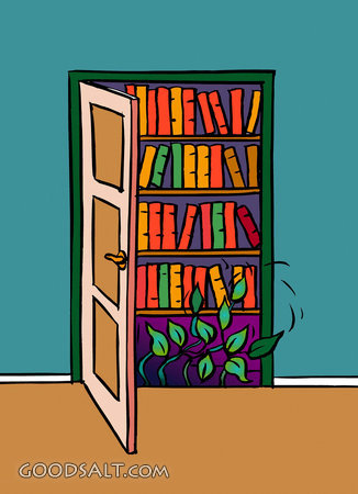 invite, growth, green, orange, colorful, library, door, open, red, plants, books, rolf jansson