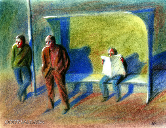 3 Men at a Bus Stop Psalm 37:7 symbolism, wait, waiting, character, people, modern, reading, chalk, drawing, stop, contemporary, shady, unsafe, bus, symbol, shadow, life, time, concept, bus stop PROJECTION - License for PowerPoint™ PRINT – buy a print of this picture; optional frame Bible Hub |
