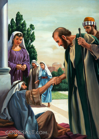Peter Heals Cripple Acts 3:6 Acts 3:1-11 standing, gate, healing, miracle, begging, crippled, woman, man, john, temple, peter, beggar, cripple, healed, beautiful, lame, acts, miracles, alms, heals, close up, the bible story, russ harlan, peter heals cripple, rhpas0094 PROJECTION - License for PowerPoint™ PRINT – buy a print of this picture; optional frame Bible Hub |