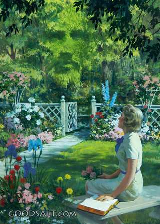 Nature - God's Second Book Psalm 19 Romans 8:18-25 Isaiah 65:17-25 Psalm 89:11 Revelation 4:11 Psalm 24:1 Job 12:7-10 Genesis 2:15 Colossians 1:17 modern, study, creation, god, green, nature, gate, christ, Jesus, bible, setting, yard, serenity, peaceful, caucasian, sidewalk, scene, woman, tree, face, garden, of, fence, open, sitting, seated, beauty, admire, trees, foliage, leaves, flowers, handiwork, harry anderson, evidence, by, sustained, nature - god's second book PROJECTION - License for PowerPoint™ PRINT – buy a print of this picture; optional frame Bible Hub |