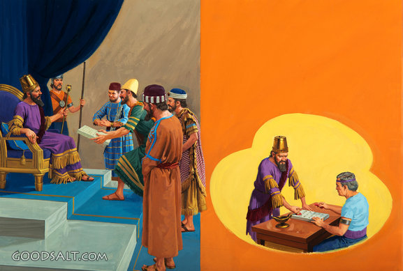 Daniel - the Plot to Destroy Brought to Darius Psalm 55:21 destroy, law, men, king, throne, daniel, darius, plot, decree, evil, declares, throneroom, rhpas0400 PROJECTION - License for PowerPoint™ PRINT – buy a print of this picture; optional frame Bible Hub |