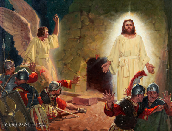 Christ's Resurrection, Angel and Soldiers Luke 24 1 Corinthians 15:4 Hosea 6:2 Matthew 16:21 Acts 2:24 Matthew 27:53 Matthew 28:6 angel, glow, messiah, risen, christ, Jesus, miracle, halo, uplifted, stone, rock, morning, fulfilled, tomb, fear, roman, savior, grave, glowing, fleeing, frightened, from, command, resurrection, easter, arm, the, soldiers, guards, third day, rhpas0531 PROJECTION - License for PowerPoint™ PRINT – buy a print of this picture; optional frame Bible Hub |