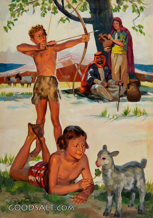 Jacob and Esau Genesis 25:19-34 standing, play, playing, lying, goat, hunter, isaac, lamb, sheep, tree, sitting, jacob, birthright, esau, arrow, bow, rebekah, brothers, and, stomach, twins, rhpas0573 PROJECTION - License for PowerPoint™ PRINT – buy a print of this picture; optional frame Bible Hub |