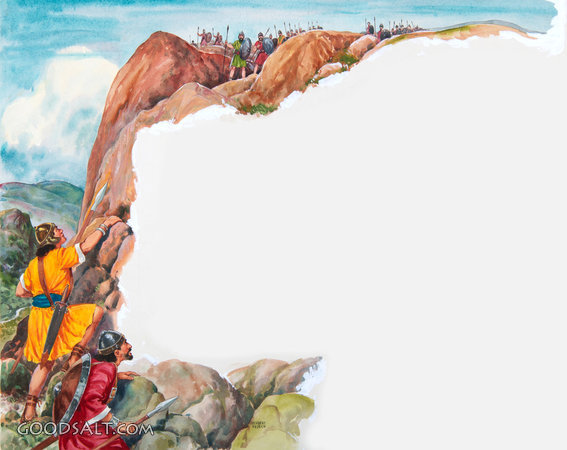 Jonathan and the Armor Bearer 1 Samuel 14:12 climb, climbing, stone, border, mountain, rock, cliff, lookout, sneaking, sneak, army, armor, jonathan, mountainside, rocks, soldiers, Philistines, cliffs, Bearer, rhpas0610, rockface PROJECTION - License for PowerPoint™ PRINT – buy a print of this picture; optional frame Bible Hub |