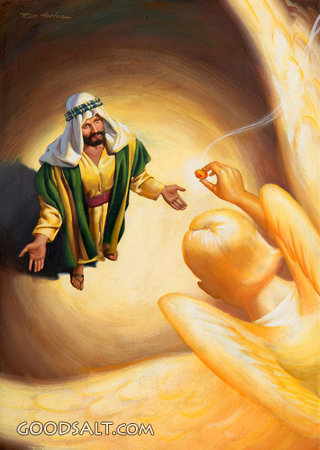 Isaiah's Commission. a Live Coal on His Lips Isaiah 6:5-8 angel, touching, coal, vision, isaiah, prophet, on, lips, touched, Touches, in vision, seraphim, a coal on his lips, rhpas0657, scene looking down PROJECTION - License for PowerPoint™ PRINT – buy a print of this picture; optional frame Bible Hub |