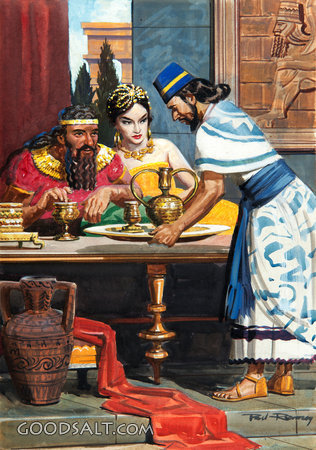The Kings Cupbearer Asks the King for Permission to Go to Ju Daniel 5:1 Daniel 5:2 drinking, drink, serve, table, woman, silver, king, wine, big, wife, sitting, sit, gold, deliver, royalty, servant, chalice, downcast, vessels, sits, delivering, glasses, Delivers, cups, jugs, rhpas0688 PROJECTION - License for PowerPoint™ PRINT – buy a print of this picture; optional frame Bible Hub |