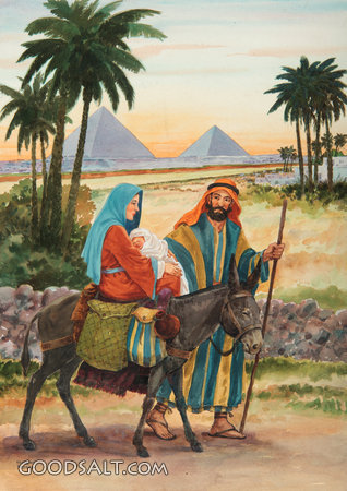 On the Way to Egypt Matthew 2:13-15 Jesus, riding, journey, herod, baby, joseph, mary, flee, egypt, donkey, pyramids, Rides, herbert rudeen, palm trees, costumew, rhpas0715 PROJECTION - License for PowerPoint™ PRINT – buy a print of this picture; optional frame Bible Hub |