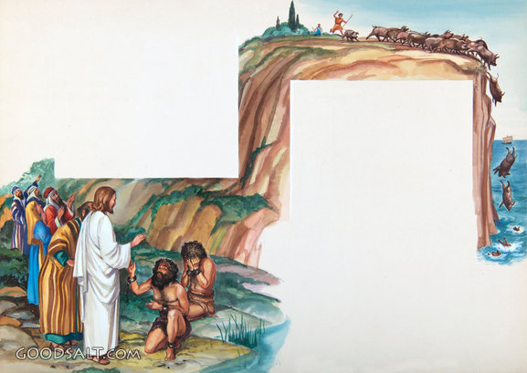 Demon Possessed Men Healed Mark 5:1-20 Matthew 8:28-34 Matthew 8:28-34 Luke 8:26-38 Jesus, healing, over, out, jump, cliff, men, swine, evil, disciples, chains, miracles, heals, drown, demonic, the bible story, pigs, william hutchinson, demon-possessed men, cast out devils, demon-possessed, rhpas0739 PROJECTION - License for PowerPoint™ PRINT – buy a print of this picture; optional frame Bible Hub |