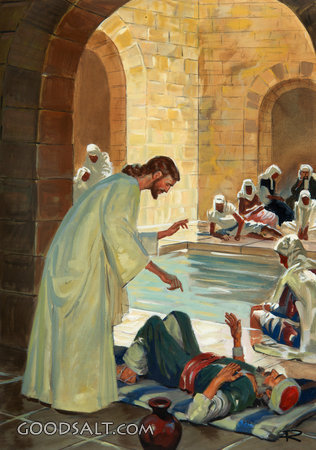 Miracle at the Pool John 5:1-15 christ, Jesus, paralyzed, pool, disease, healing, mat, sick, miracle, lying, crippled, over, bending, porch, man, jerusalem, lame, bethesda, on, infirmity, steps, curing, heals, cures, miracle at the pool, rhpas0752 PROJECTION - License for PowerPoint™ PRINT – buy a print of this picture; optional frame Bible Hub |