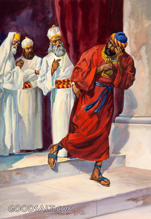 Judas Leaving the Priests After Betraying Jesus Matthew 27:3-10 lord, master, leaving, betrayed, sold, betrayal, disciple, silver, judas, thirty, shame, of, cement, leaves, is, and, pieces, priests, steps, the bible story, william heaslip, rhpas0799 PROJECTION - License for PowerPoint™ PRINT – buy a print of this picture; optional frame Bible Hub |