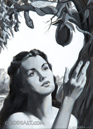 The Seduction of Eve in Black and White. Genesis 3:6 temptation, reaching, black, white, snake, eve, garden, of, serpent, up, eden, genesis, and, winged, Reaches, forbidden fruit, vernon nye, the fall, rhpas0904 PROJECTION - License for PowerPoint™ PRINT – buy a print of this picture; optional frame Bible Hub |