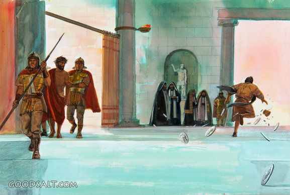 Thirty Pieces Matthew 27:3 Jesus, judas, soldier, roman, easter, passion, rhpas0106, jesus watercolor, decision time, zacccaeus, daming, 110_01_0008_biblepaintings, pamphylia PROJECTION - License for PowerPoint™ PRINT – buy a print of this picture; optional frame Bible Hub |
