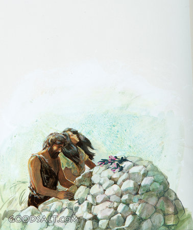adam, eve, abel, cain, death, grave, palm trees, jesus heals a blind man, cotta, votive, beama